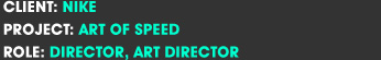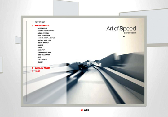 Housed in an online experience, DVD, as well as a traveling festival, Nike's Art of Speed is a collection of 15 contemporary filmmakers' interpretation of speed. Experience the "World of Speed" festival trailer, a futuristic 3D online theater, and dynamic film interstitials and animations.