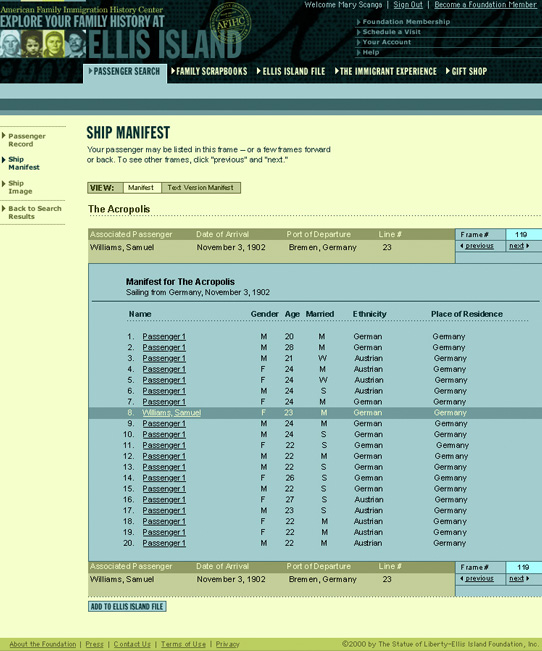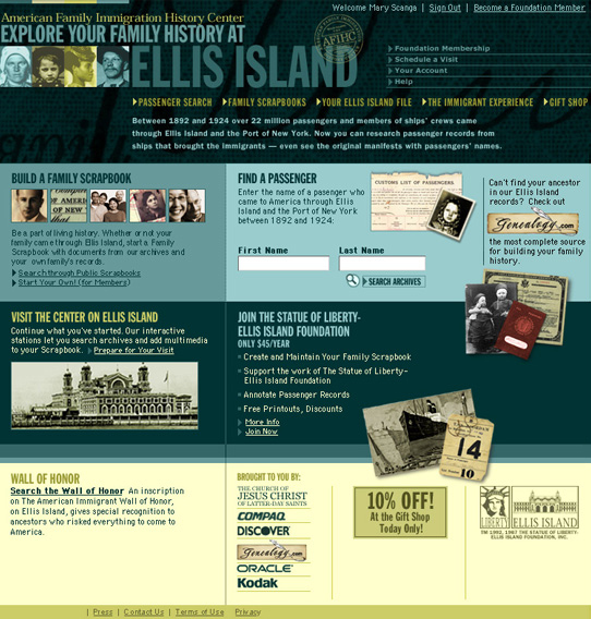 Ellis Island is the symbol of American immigration and the immigrant experience. Users have the ability to search for their ancestors who arrived through the famous port and can view actual ship manifests and passenger records. They can also purchase these records as mementos for future generations to cherish.