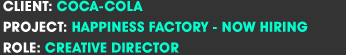 We decided to announce that the Happiness Factory is now hiring. Our goal was to turn passive fans of the Happiness Factory into engaged, interactive employees. They could then visit the factory. Get an inside look at the specific job. Apply for a position. And most importantly, have a hilarious time at work while making the most famous beverage on the planet.